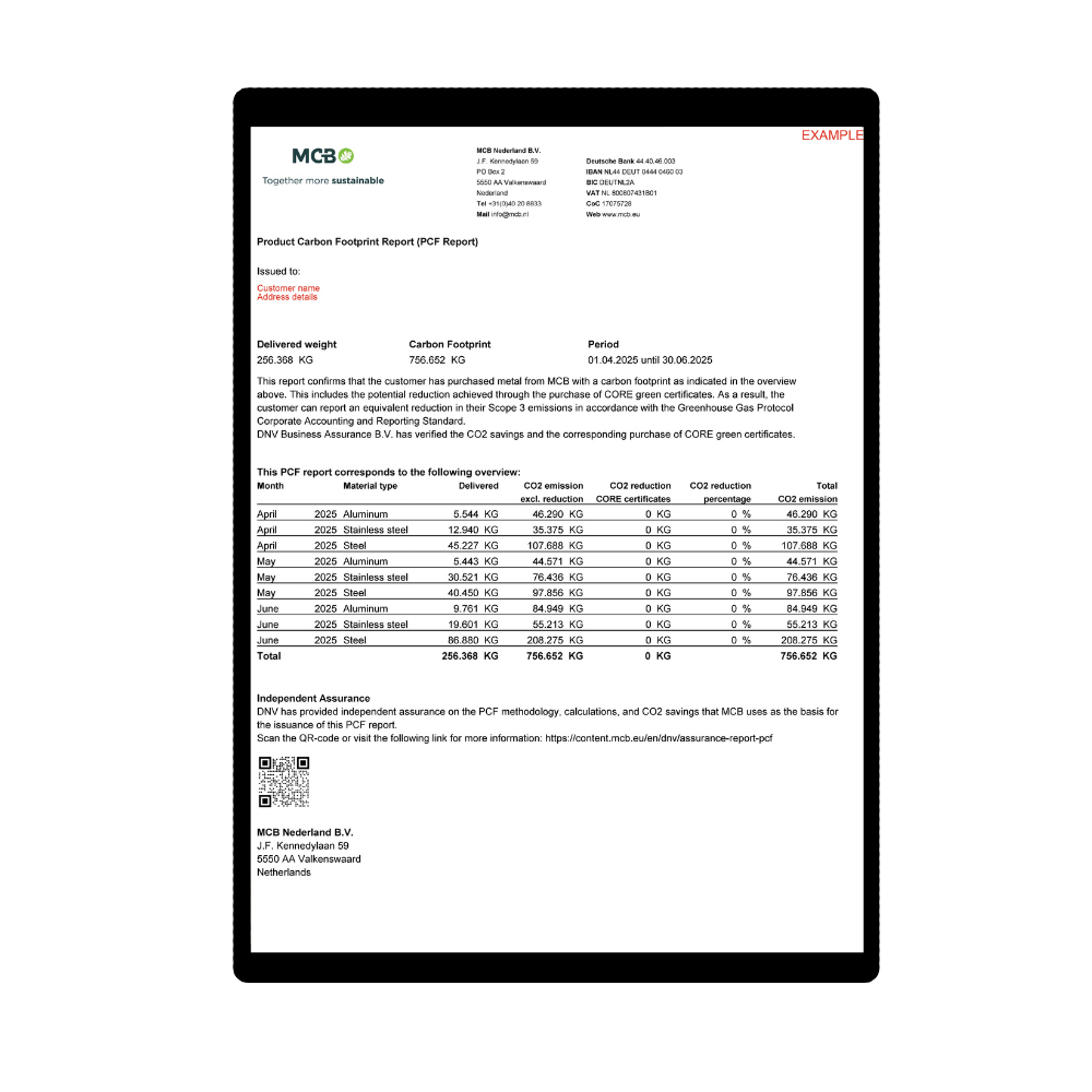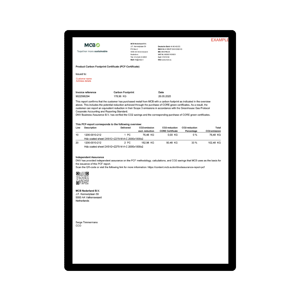 Un certificat CORE est une preuve officielle et certifiée que vous avez acheté du métal durable chez MCB, incluant une réduction de CO₂ démontrable. Cette réduction est calculée conformément au Greenhouse Gas Protocol et vérifiée par un organisme indépendant. Avec ce certificat, vous pouvez inclure la réduction des émissions Scope 3 correspondante dans votre propre rapport de durabilité.